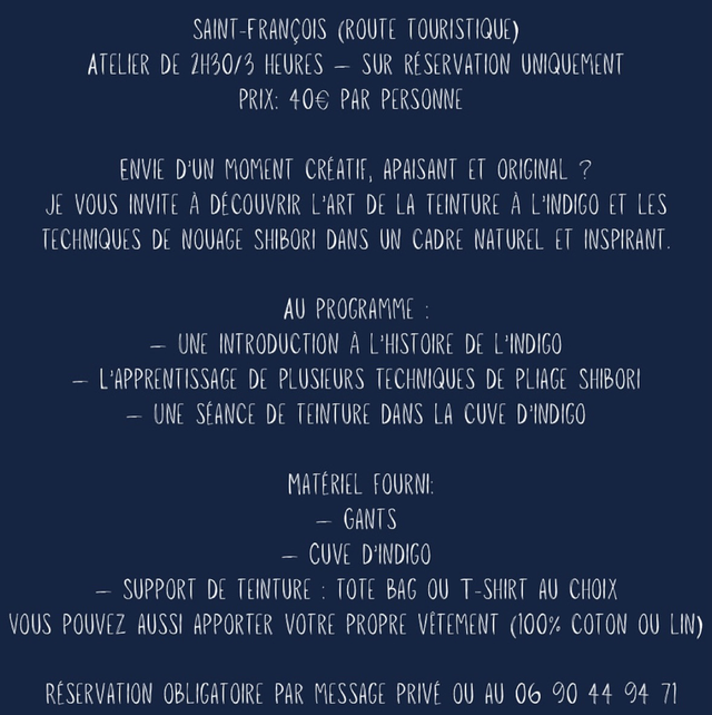 Plongez dans l’univers fascinant de la teinture à l’indigo lors d’un atelier créatif de 3 heures, à Saint-François, sur la route touristique en direction d’Anse à la Barque.